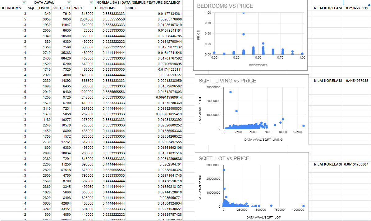 Dari 17 variabel independent yanga ada, kita mengambil 3 variabel saja untuk melakukan pengujian yaitu bedrooms, sqft_living dan sqft_lot. Lakukan anlalisa data menggunakan excel dengan langkah - langkah sebagai berikut :
