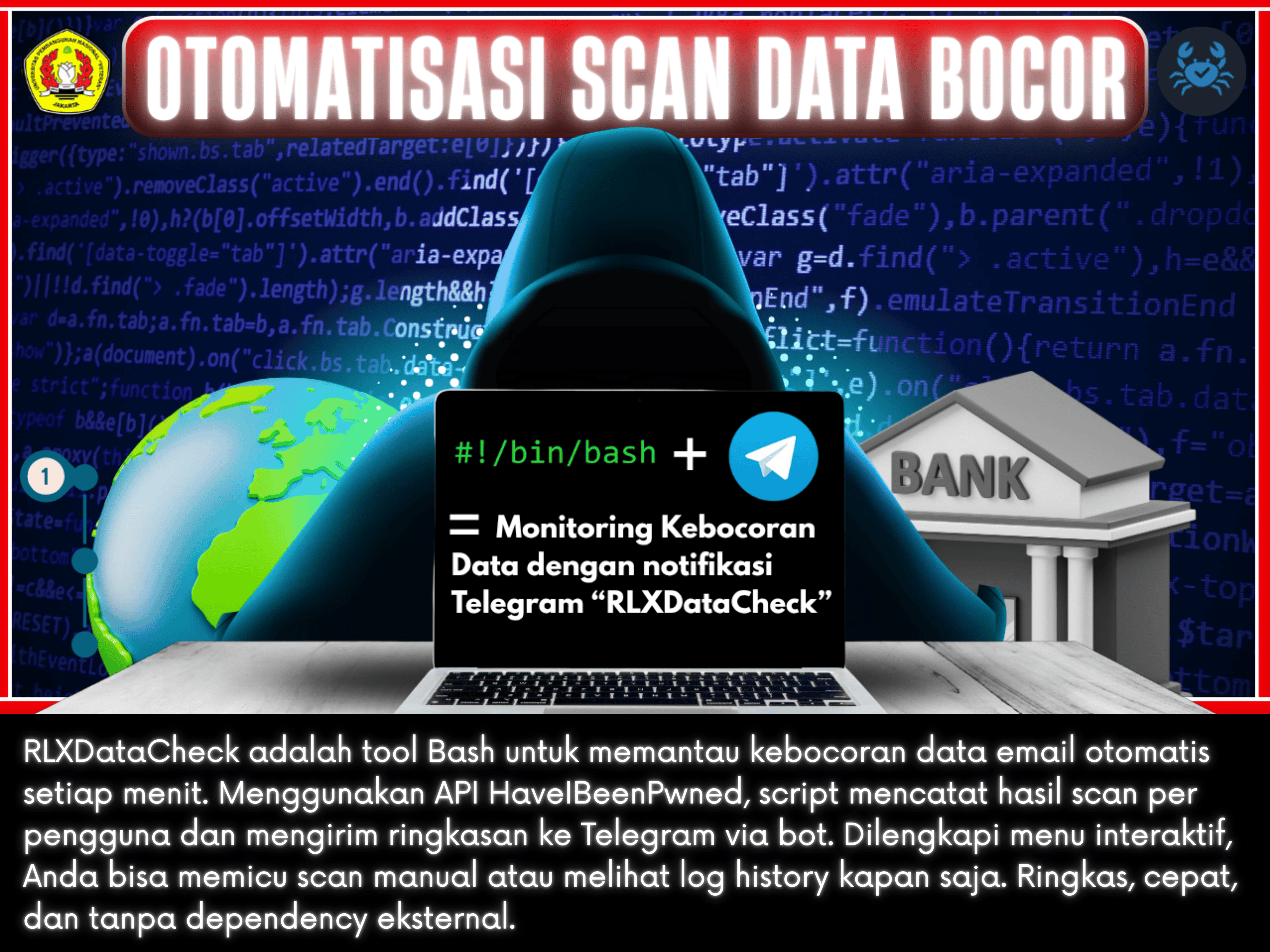 Melalui project RLXDataCheck, Project ini berhasil membuktikan bahwa keamanan data pribadi bisa diawasi secara otomatis hanya dengan pemanfaatan script sederhana berbasis Shell. Dengan sistem pemantauan yang berjalan setiap menit dan pemberitahuan langsung ke Telegram, pengguna dapat segera mengetahui apabila ada indikasi kebocoran informasi pribadi hanya dengan statement “Email SAFE” & “Email UNSAFE”. Pemanfaatan fitur crontab menjadikan tools ini berjalan secara rutin tanpa perlu dijalankan manual (walaupun bisa juga secara manual), Program ini cocok diterapkan dalam berbagai kondisi, baik untuk menjaga keamanan data individu maupun tim kecil atau bahkan organisasi.