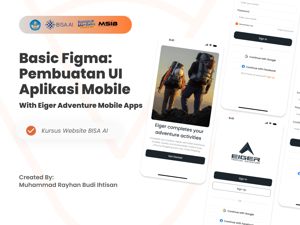 This portfolio showcases the results of a UI/UX design project I completed as part of the Basic Figma: UI Creation for Mobile Application training held by BISA AI and Kampus Merdeka. The case study focuses on the Eiger Adventure mobile app, a brand widely recognized in Indonesia for its high-quality outdoor gear. The primary goal of this project was to design a user interface that is clean, modern, and highly usable—especially for users who are passionate about outdoor adventures like hiking, camping, or backpacking. Throughout the project, I utilized Figma to design an intuitive user flow, starting from the onboarding screen to the Sign In and Sign Up pages. I applied consistent style guides using the Poppins typeface and a professional color palette including #1C252C (dark), #FF7C34 (orange), and #5D5D5D (gray), ensuring visual clarity and brand alignment. Each UI element was carefully crafted with attention to visual hierarchy, accessible contrast ratios, and user-centered interaction. This project has deepened my understanding of mobile design principles and improved my ability to translate user needs into functional, aesthetically pleasing interfaces. Overall, this portfolio reflects my core competencies in UI/UX design, especially in mobile app development. I am always open to new challenges and collaborative opportunities in building impactful digital experiences that prioritize user satisfaction.