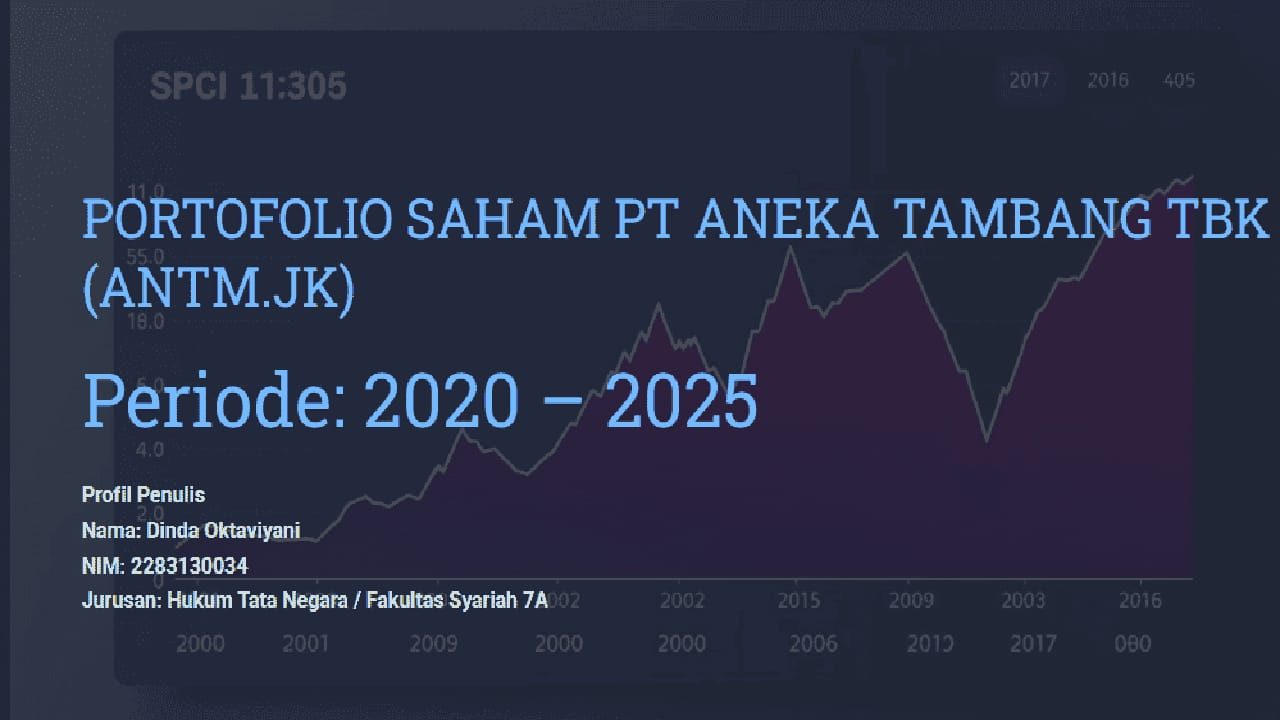 Portofolio ini berisi analisis komprehensif terhadap pergerakan saham PT Aneka Tambang Tbk (ANTM.JK) selama periode 2020–2025. Kajian ini mencakup profil perusahaan, tren harga saham berdasarkan data grafik, serta analisis teknikal menggunakan indikator SMA (Simple Moving Average) dan forecast. Hasil analisis menunjukkan bahwa saham ANTM memiliki tingkat volatilitas yang tinggi namun tetap prospektif dalam jangka menengah hingga panjang. Kinerja positif saham ini didukung oleh meningkatnya permintaan global terhadap nikel dan emas, serta peran ANTM dalam rantai pasok industri baterai kendaraan listrik.Portofolio ini juga menyoroti faktor-faktor risiko seperti fluktuasi harga komoditas dunia, perubahan regulasi ekspor mineral, dan ketidakpastian ekonomi global. Kesimpulannya, ANTM dinilai sebagai salah satu portofolio unggulan sektor pertambangan nasional dengan prospek jangka panjang yang kuat.