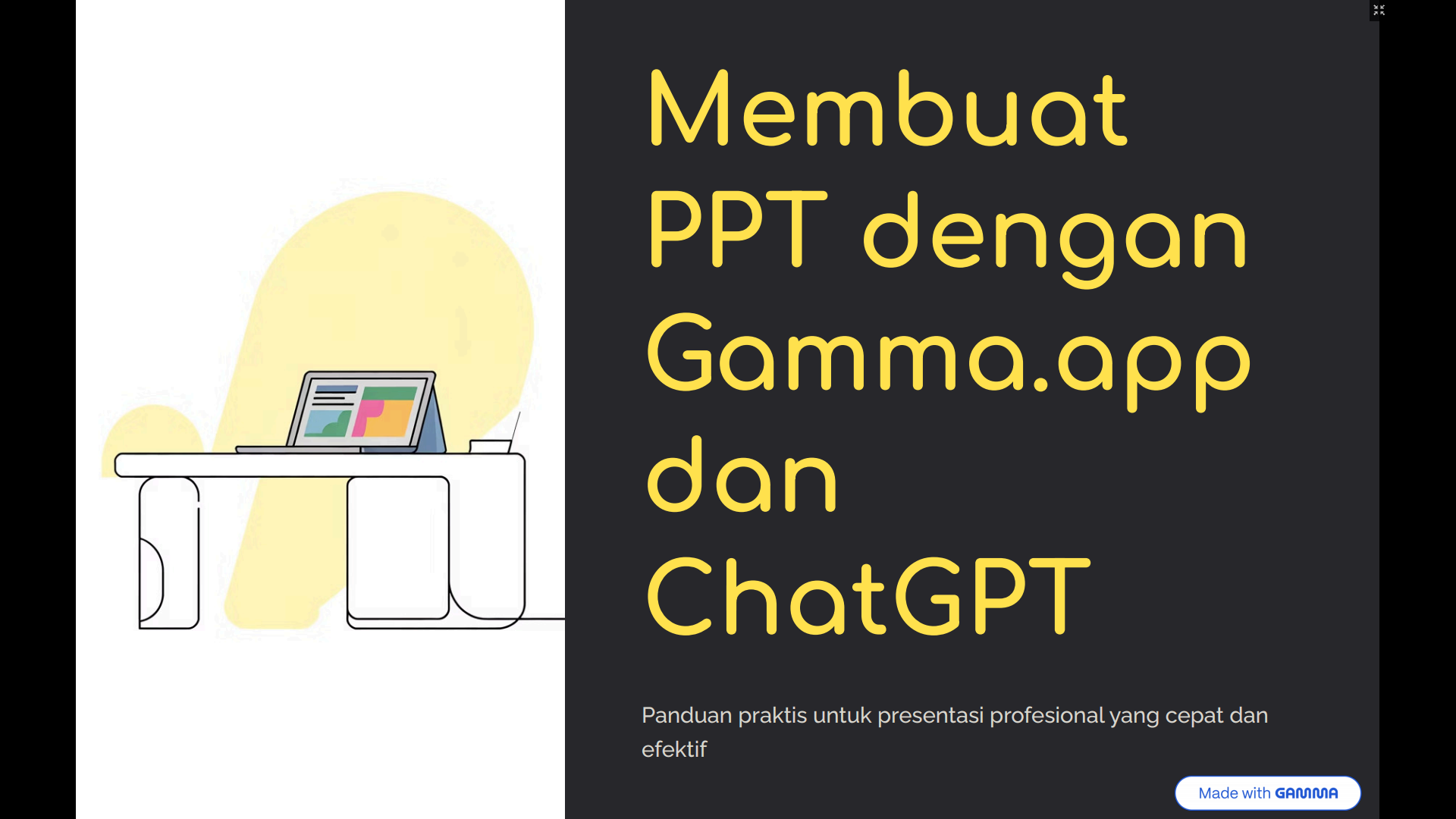 Dengan memanfaatkan Gamma.app dan ChatGPT, proses pembuatan presentasi dapat dilakukan dengan lebih cepat, efisien, dan profesional. Langkah pertama adalah meminta ChatGPT menghasilkan materi yang lengkap, terstruktur, dan relevan sesuai topik yang dibutuhkan. ChatGPT dapat memberikan outline, penjelasan rinci, contoh poin-poin utama, serta ringkasan sehingga pengguna memiliki pijakan materi yang jelas. Setelah konten disiapkan, materi disalin dan ditempelkan ke dalam Gamma.app. Gamma kemudian mengolah teks tersebut menggunakan kecerdasan buatan untuk membentuk slide otomatis dengan layout yang rapi, visual yang sesuai, dan struktur yang mudah dipahami. Pengguna dapat meninjau hasil draft tersebut, melakukan penyesuaian pada kalimat, menambah bullet point, mengatur ulang urutan slide, dan memilih template desain yang paling cocok dengan gaya presentasi. Gamma.app juga menawarkan fitur seperti auto-enhance, rewrite, serta generator visual yang membantu mempercantik tampilan slide tanpa usaha berlebihan. Setelah semua penyesuaian selesai, pengguna dapat melakukan pengecekan akhir untuk memastikan konsistensi warna, font, dan alur informasi sebelum mengekspor hasil akhir. Presentasi dapat disimpan dalam format PDF, PowerPoint, atau dibagikan sebagai link yang dapat diakses online. Dengan integrasi ChatGPT dan Gamma.app, pembuatan presentasi menjadi lebih praktis, menarik, dan berkualitas tinggi. Solusi ini sangat membantu pelajar, profesional, maupun kreator konten yang membutuhkan presentasi cepat tanpa mengorbankan kualitas visual dan kedalaman materi tinggi.
